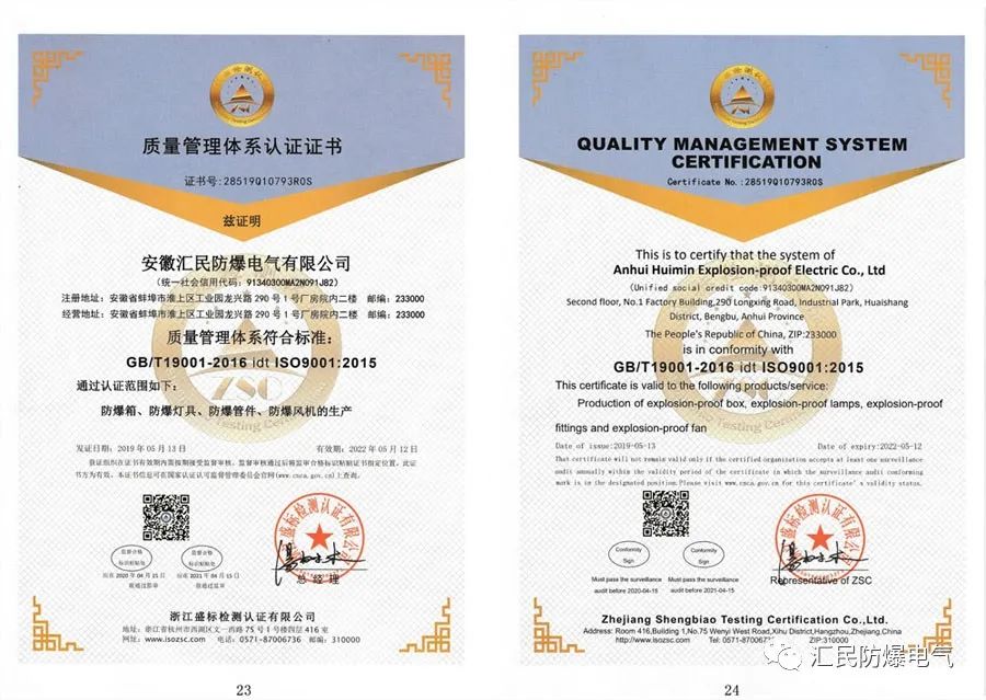 防爆合格證,3C強制產(chǎn)品認證證書,ISO9001質量管理體系認證證書。
